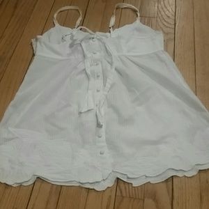Very cute white top. Perfect for spring/summer. I believe it's from forever 21 but not positive. Has cute flower details at bottom and at the top. Back has mock buttons and a tie. There is a zipper located on the side.
