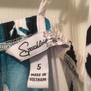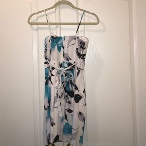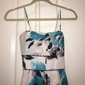 Black/white/blue dress, with spaghetti straps, and a tie around the waist