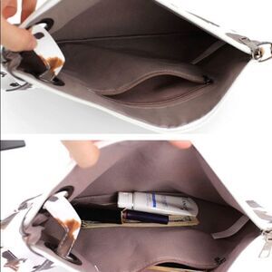 Two open inside pockets. Zipper closure. Approximately 8.5 inches by 12.5 inches