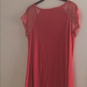 This cute coral tunic style top by Glitterscape is perfect for summer! Done in a comfy rayon/spandex material, it has a stud embellished front, lace cap sleeves and an asymmetrical hem. It is size medium. It measures 31 inches in length from the top of the shoulder to the longest side of the hem. It measures 16 inches across from armpit to armpit with lots of stretch. Only worn a couple of times, it is in excellent condition!