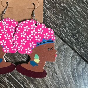 Ladies lightweight wooden laser cut earrings with hand painted detailing of African Lady. New in plastic. Approximately 2.5” x 1”.