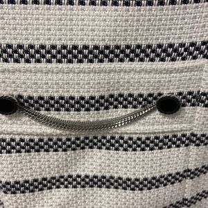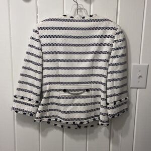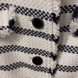 Cute, black and white striped Detail jacket with silver and black buttons initials inside WNB I think. The size tag and the fabric tag have been cut out. I believe it to be a size small and a linen polyester type fabric looks almost like a tweed.