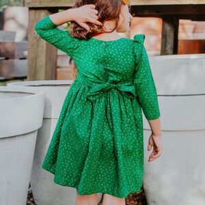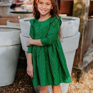 Cuteheads, Texas, TX, Little Girl's, Dress, Formal, Casual, Green, Gold, Stars, Cotton, Statement Sleeves, Flutter Sleeves, Cute, Preppy, Classic, Photo Shoot, Christmas, Winter, Fall, Spring, Long Sleeve, 3/4 Length Sleeves