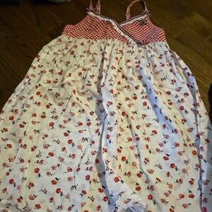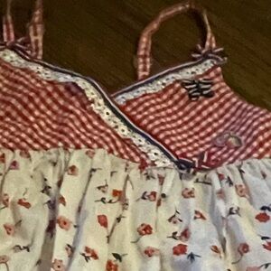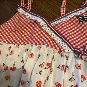 Red Gingham & Floral Sundress. This charming sundress features a playful red and white gingham checkered bodice with a cross-over design, leading into a light-colored skirt adorned with a delightful pattern of small red and pink flowers. Adjustable spaghetti straps complete this lovely, airy dress, perfect for warm weather and charming occasions!