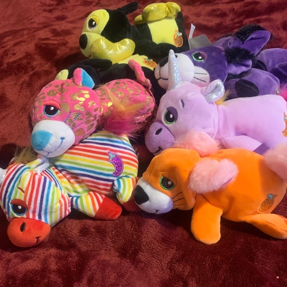 Set of colorful plush animal toys. Includes vibrant designs with stripes, polka dots, and unicorn features.(8)