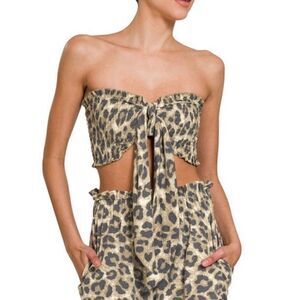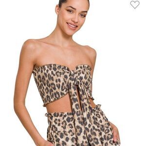 Cute top and short set with leopard print. Elastic type to tie up an elastic way. Short comes in small medium large extra large lots of stretch, comfy T-shirt material.