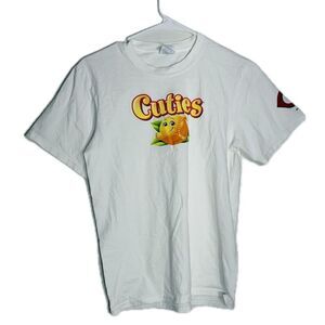 This shirt is in great used condition, has the phrase cuties, and a picture on the front otherwise solid color
