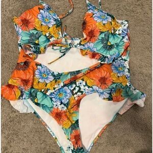 Cut-out MULTICOLORED FLORAL CUT OUT KNOT RUFFLE SWIMSUIT SZ 3X