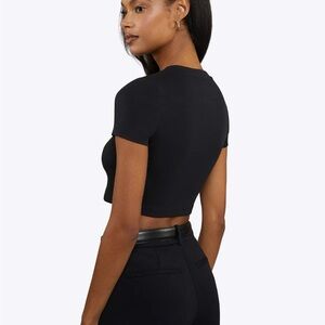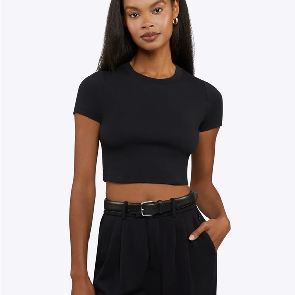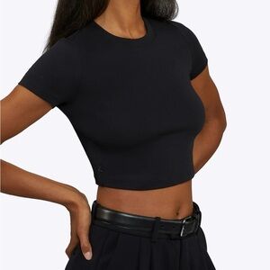 Sleek black crop top for a modern look. Perfect for versatile styling.