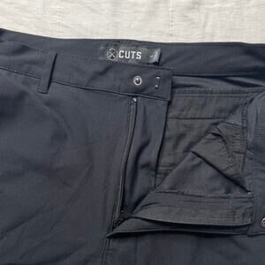 Cuts AO Jogger pants in the black color, size large. Features a modern jogger cuff, side elastic at the waistband for comfort and flexibility, and a zippered fly with a snap closure. Good preowned condition. Has one small faint spot on the front left leg.