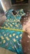 Stunning, vibrant maxi dress with a fitted silhouette and wide ruffle sleeves. Gorgeous multicolor print on bright turquoise fabric. The dress has a flattering V-neckline, decorative trim, and a flared mermaid-style bottom.