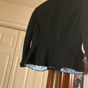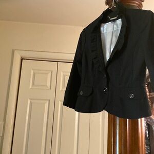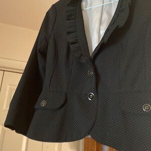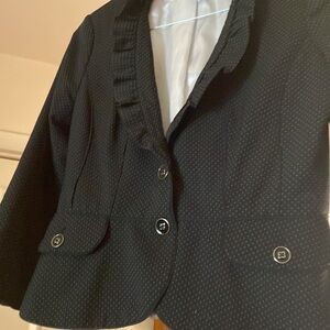 This jacket is very stylish navy blue with little pink spots ruffled collar nice detail and buttons really nice