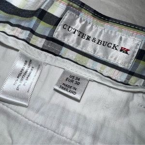 Cutter & Buck CB Men's Flat Front Plaid White Black Green Sz 34 Inseam 9.5.  Excellent Condition - No rips, tears, holes or stains.  Shipped  from a non smoking home with no pets.