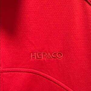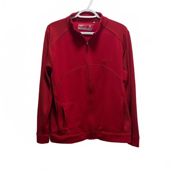 Vibrant red jacket with full-zip closure. Features convenient side pockets. Ideal for everyday wear. Excellent jacket. No longer needed. If you have the patience and good eyes you can remove the embroidery.