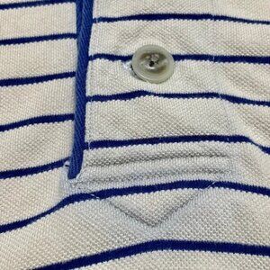 This men's polo is in good pre-owned condition with no holes but does have some color transfer on the placket and 2 small bleach stains on the bottom hem.