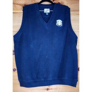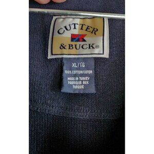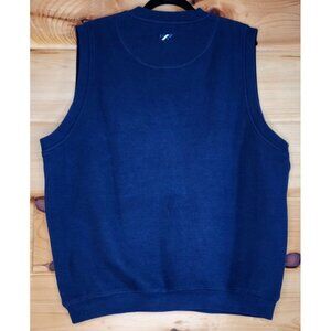 This Cutter & Buck Golf Vest is designed for men and features a sleeveless, short-length design perfect for layering during golfing sessions in cooler weather. Made of 100% cotton knit fabric in a solid blue color, this vest showcases a large logo accent on the front. The pullover style with a regular fit and size L offers comfort and ease of movement for golf activities in winter, fall, or spring seasons. Easy to care for with machine washable instructions, this vest is a stylish addition to any golfer's wardrobe.