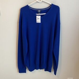 Cobalt blue , V neck sweater with jersey stitched look and gray contrast stripe details at inside neck and cuff. Ribbing at hem and outside lining at the seams. NWT