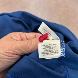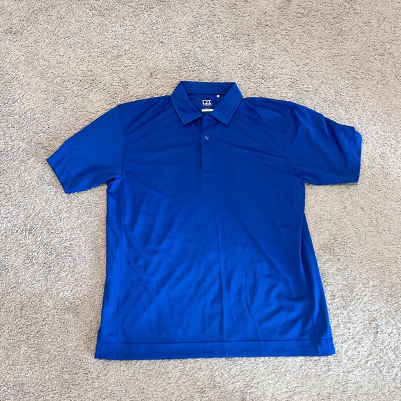 This polo is blue with short sleeves. It CB DryTec. It has a logo on the sleeve Tradition Heritage Famly