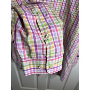 Pastel green, yellow, purple, pink and white plaid button down long sleeve shirt with button down collar and one slip chest pocket.