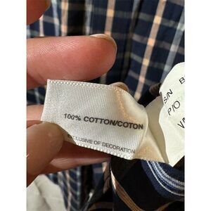 This men's button-up shirt is a classic addition to any casual fall wardrobe. Made from 100% cotton, it features a blue plaid pattern with a button-down collar and long sleeves. The shirt is designed with a classic fit and a button-up front closure. It is machine washable for easy care. The shirt is pre-owned.