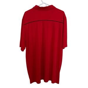 This is a red Cutter & Buck men's polo shirt in size 2XL. It features a collared neckline, short sleeves, and a pullover closure. Made of 100% polyester with a light fabric wash, this classic sports-themed shirt is suitable for summer wear and golf activities. The regular fit shirt is machine washable and has a spread collar style, perfect for casual or sporty occasions.