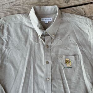 Keywords: Cutter & Buck, long sleeve, button-up, tan, men's shirt, casual, Baylor University, embroidered logo, collared, regular fit, pre-owned, quality materials, game day, office wear, solid pattern.