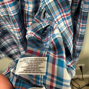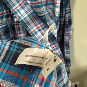 Vibrant plaid design with a mix of blue, red, and white. Ideal for casual wear. Button-down style for a classic look.
