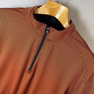 The Cutter & Buck Pullover Mens XXL Virtue Eco Pique Micro Stripe Recycled 3/4 Zip is a stylish and eco-friendly golf shirt made from recycled polyester. This classic polo features a striped pattern in College Orange and Navy Blue, with a collared neckline and long sleeves. The lightweight fabric wash ensures comfort on the golf course, and the contrasting trim adds a touch of style. This pullover is perfect for all seasons and can be personalized for a unique look. Whether you're hitting the links or just want a casual yet sporty top, this shirt is a great choice for any golfer.