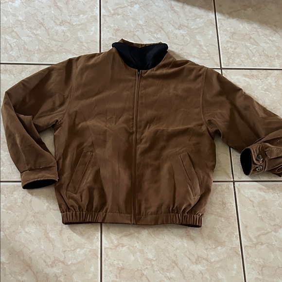 Stylish tan bomber jacket. Features ribbed cuffs and hem. Ideal for everyday wear.