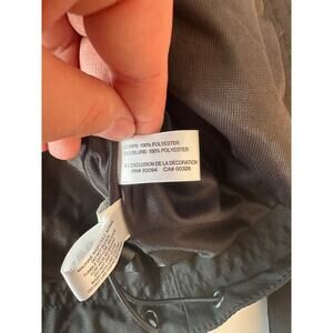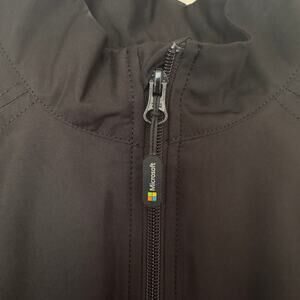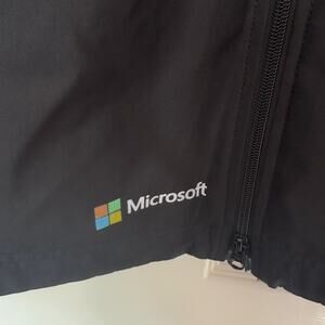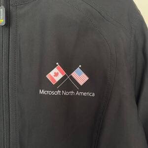 Has “Microsoft North America” with American and Canadian flags on the front, and says “Microsoft North America USA” on the back. Has a double zipper and the top zipper also says Microsoft with the logo.