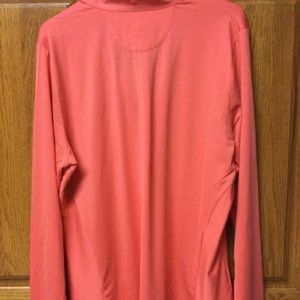 Ladies Golf pullover in a pretty bright salmon color with a dark orange pinstripes