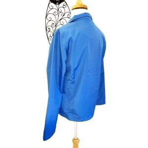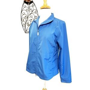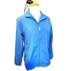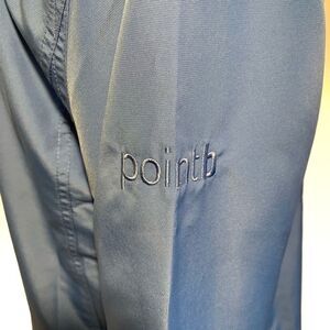 Lightweight blue windbreaker by Cutter & Buck. Zip up front and two pockets. Has pointb embroidered on the left arm sleeve. Excellent condition.