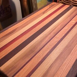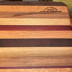 Custome Made Cutting Board - Custom made edge-grain - Local artisan made cutting boards. Yes! The Kennesaw Woodpecker has been designing and custom making high end dinning room tables, butcher block tables, bowls and cutting boards! (In Marietta, GA) I will be listing several cutting board options. From $35 for an everyday board to $195 for the top of the line, end-grain board. And something in between! This board is edge-grain! Just look at the intricate detail of the various types of hard woods. All locally and US sourced hard woods. This board has smooth corner edges, with inlaid grip handles. All finished with food grade products. Please see pictures for details. (Approx size 17.75x11.5x1.5) Local pick up can be arranged. (Marietta,GA). Please message before purchasing, so we can eliminate shipping cost. Thank you! Lorraine.
