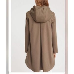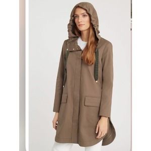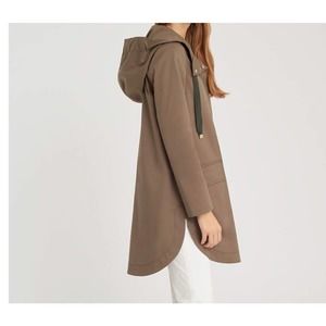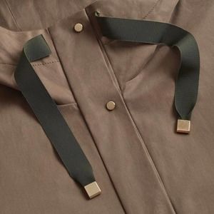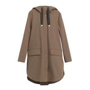 Stylish green brown coat with a hood. Features front pockets and a sleek design. Perfect for versatile wear.