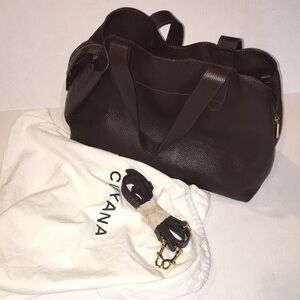 Elegant dark brown leather shoulder bag. Features sturdy handles and a spacious interior. Includes a detachable strap for versatility.