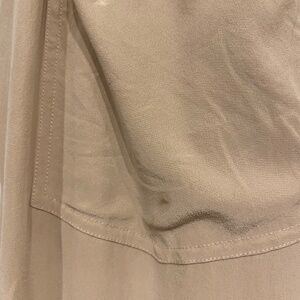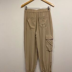 Silk cargo style light weight jogger pants. Elastic waist with side pockets. Super easy to dress up or dress. Down. There are a couple of tiny dot stains, shown in the close up photos. Size small.