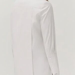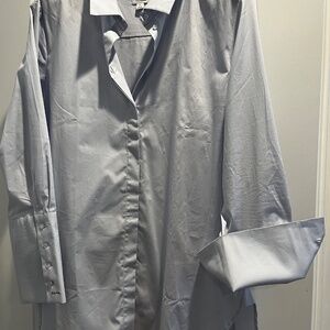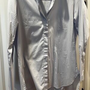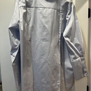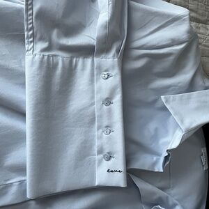 Poplin button down shirt, new, light blue color, overlap back, embroidery on the right cuff “love” in navy