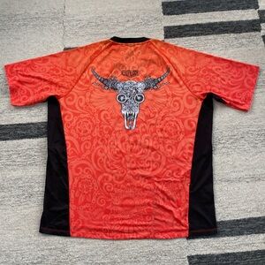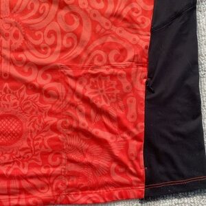 Short sleeve men’s cycling shirt. Side back zipper pocket. 82 % polyester 8% spandex. Center back length 30 inches. Hand wash.