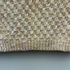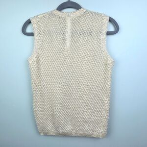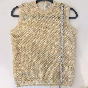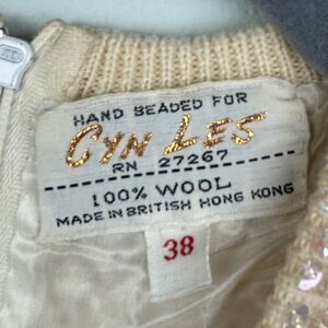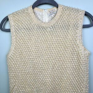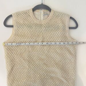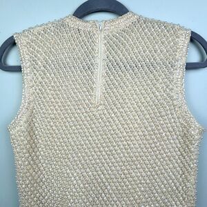 Cyn Les vintage hand beaded sleeveless top in cream. This stunning shirt is made of 100% wool and features ornate pearl beads and sequins woven into the sweater like knit. Crewneck, lined, beautiful sequin trim on edges. Back zip closure. This unique vintage find was made in the 50's or 60's. Women's vintage size 38 - fits around a modern US small, but please refer to photos of measurements. Excellent vintage condition.