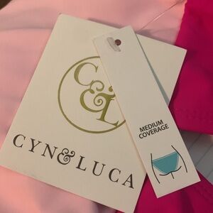 Cyn & Luca colorblock one piece swimsuit with medium coverage, scoop neckline, padded bust, cutout at empire waist, moderate cut legs, halter tie straps at nape and dual hook closure back straps.