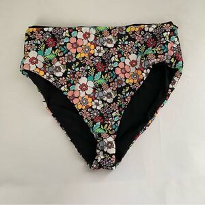 One side is solid black other side is colorful floral. High waist high leg.