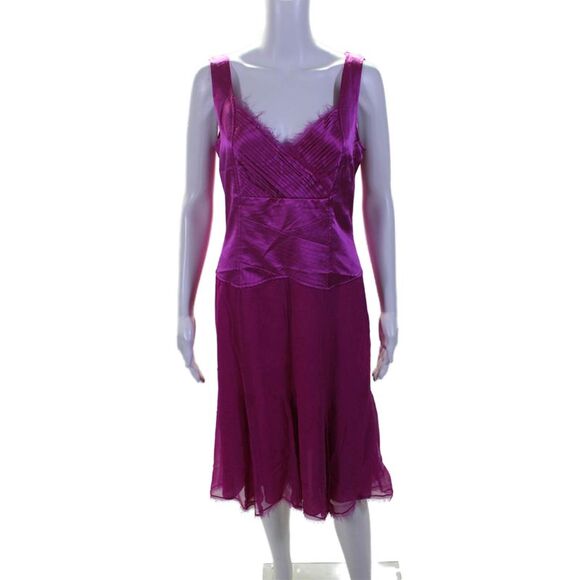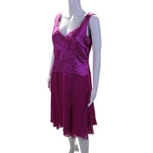 This Cynthia Cynthia Steffe dress in pink, size 12, is perfect for spring festivities. With a V-neck and sleeveless A-line style, this mid-calf dress boasts a solid pattern and a polyester material. The zip closure and gently worn condition make it a charming pre-owned find. The bust measures 26 inches, waist 30 inches, and hips 32 inches, ensuring a flattering fit for any occasion.