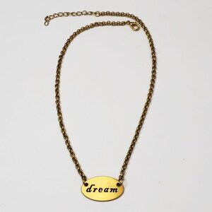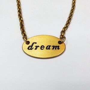 This is an elegant matte gold tone chain necklace featuring an oval 'dream' pendant. Designed by Cynthia Garrett and crafted in India.