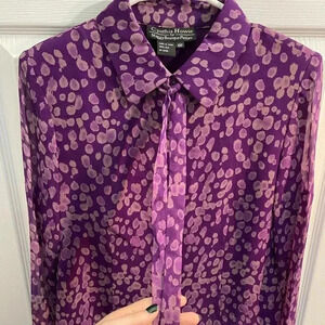 Vintage 100% silk Y2K purple blouse with pussybow, sheer sleeves, and matching purple buttons. Gorgeous matching silk skirt and the skirt is fully lined.