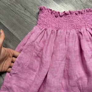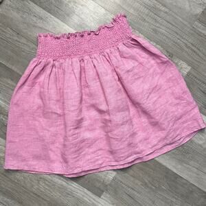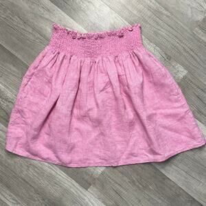 Cynthia Rowley 100% linen mini skirt in a dreamy pink. Features a smocked elastic waistband with a ruffled edge and a flouncy, flowy silhouette. Lightweight and breathable, perfect for spring/summer styling. Has Pocket, Size Small Good Condition