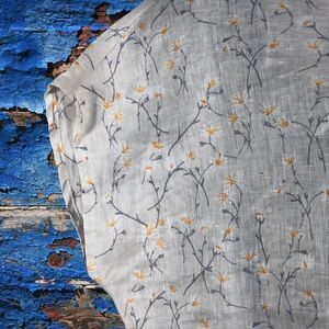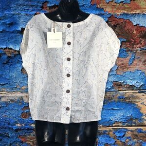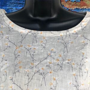 Cynthia Rowley 100% Linen Blouse Cream with gray and gold abstract flowers Sz Sm