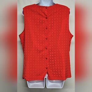 This top is in excellent condition with no holes, stains, or pilling. Like new condition. Full button back. Sleeveless. Cut out style. The color is bright coral or orange.