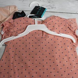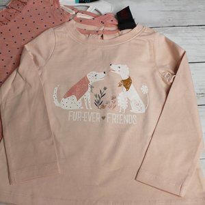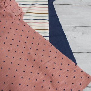 This four-piece casual mix and match set includes a pink and navy blue polka dot tunic top with short flutter cap sleeves, a long sleeve casual top with dalmation and poodle dogs, cream color pull on leggings with pink, blue and brown stripes and solid dark blue capri pants with an attached skirt and elastic waist. The items coordinate and are really nice quality. The set is brand new with tags.
