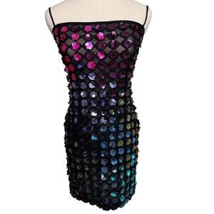 Super stretchy, sheer. Hidden side zip with hook & eye closure. Adjustable straps. Sparkle all night!