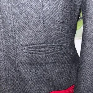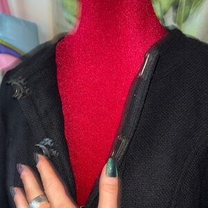 This Cynthia Rowley blazer in classic black features a collarless design with a round neckline, offering a sleek and professional look. The tailored fit and medium-weight fabric make it ideal for business or formal occasions, ensuring versatility and style.